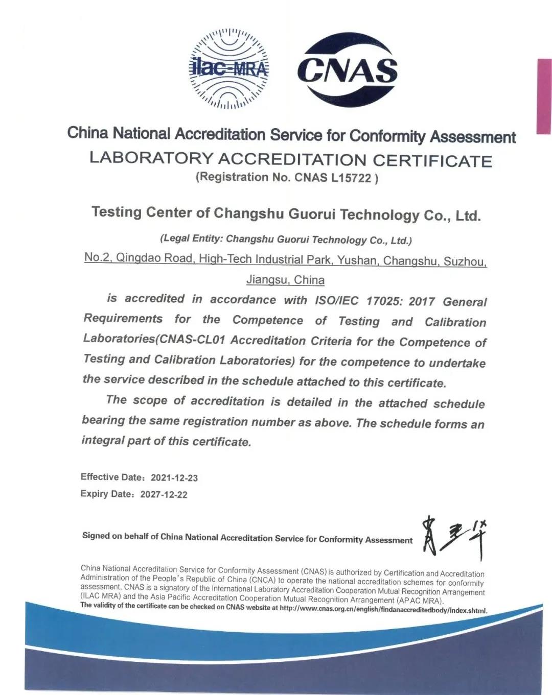 本次獲得CNAS認可資質證書,標志著國瑞科技公司檢測中心具備國家及國際認可的硬件條件、檢測技術和管理水平,是對檢測中心專業(yè)技術水平、檢測能力的客觀肯定。同時該中心可依據(jù)國際認可準則開展檢測服務,出具的檢測結果在行業(yè)內具有更高的認可度和公信力,為客戶提供更優(yōu)質高效的服務,為國瑞科技公司產品的可靠性保駕護航,增強市場競爭能力。